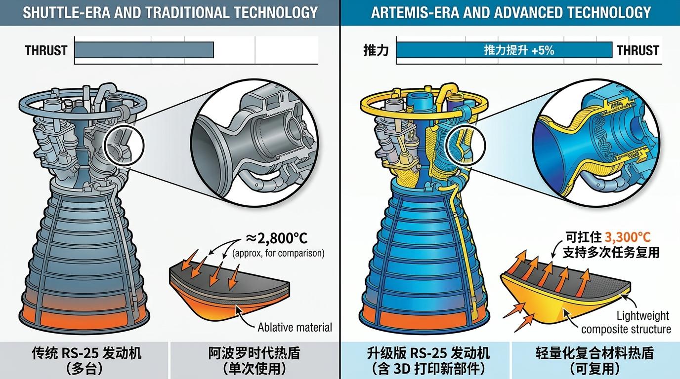 这些测试里藏着登月任务的所有焦虑。比如SLS火箭的RS-25发动机,这次用到了三台航天飞机时代的“老兵”和一台3D打印的新发动机,推力比航天飞机时期提升了5%,要确保能把未来的着陆器、月球门户舱一次性送进轨道;比如猎户座的热防护盾,用了更轻的复合材料,要扛住返回地球时3300℃的摩擦高温——阿波罗时代的热盾是一次性的,现在的设计得支持多次任务复用。