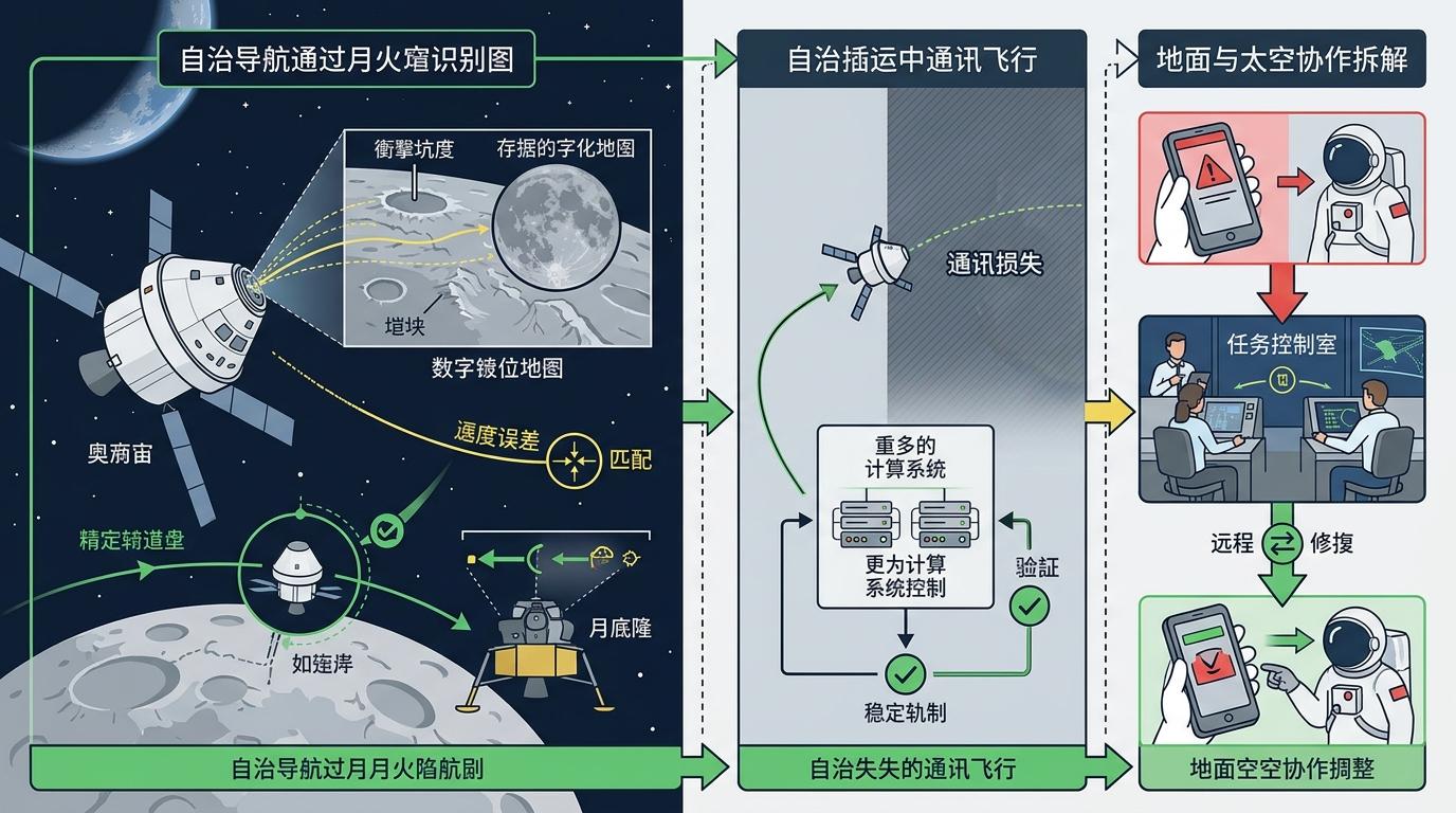 深空里的每一次操作都在为登月链打补丁。他们测试了猎户座的自主导航——靠识别月球陨石坑匹配数字地图,误差能压到100米内,这是未来月球轨道对接、着陆器精准落月的核心能力;他们演练了通信中断后的自主飞行,当飞船绕到月球背面和地球失联的40分钟里,四台冗余计算机将接管所有操作,确保轨迹不偏航。甚至连宇航员用的平板软件故障,地面团队都通过远程桌面完成了修复——这种地面与太空的协作效率,是未来长期驻月时的必备保障。