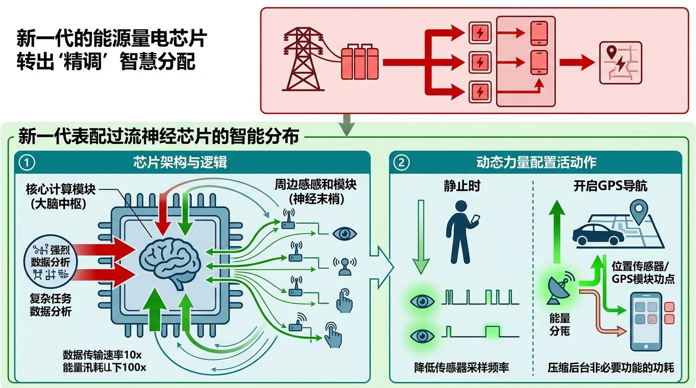 这场革命的核心,是把“傻大粗”的电量消耗,变成“精打细算”的智能分配。新一代能效芯片用上了类似人体神经系统的分工逻辑:核心计算模块像大脑中枢,处理复杂任务时全力运转;外围传感和通信模块像神经末梢,用低频电信号传输数据——这种设计让数据传输速度提了10倍,能耗却降了100倍。它不再是一味“省电”,而是让每一毫瓦电都用在刀刃上:当你静止时,自动降低传感器采样频率;当你开启GPS导航,优先调配能量给定位模块,同时压缩后台非必要功能的功耗。