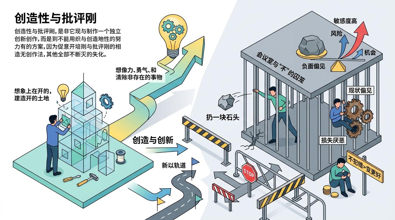这源于创造与批评之间天然的不对称性——前者是在空地上盖房子,要想象力、勇气,要把不存在的东西一点点说清楚;后者是扔一块石头,只需要瞄准墙缝里的一道裂纹。花五分钟讲透一个想法能打开的新赛道,只需要两秒就能被“听起来风险很高”堵回去。而我们的大脑,天生就是为批评而生的:负面偏见让我们对风险的敏感度是机会的三倍,现状偏见让我们本能抗拒改变,损失厌恶让我们把“不犯错”看得比“变更好”重要十倍。这种认知捷径能帮原始人避开老虎,却会把会议室变成只允许说“不”的囚笼。
