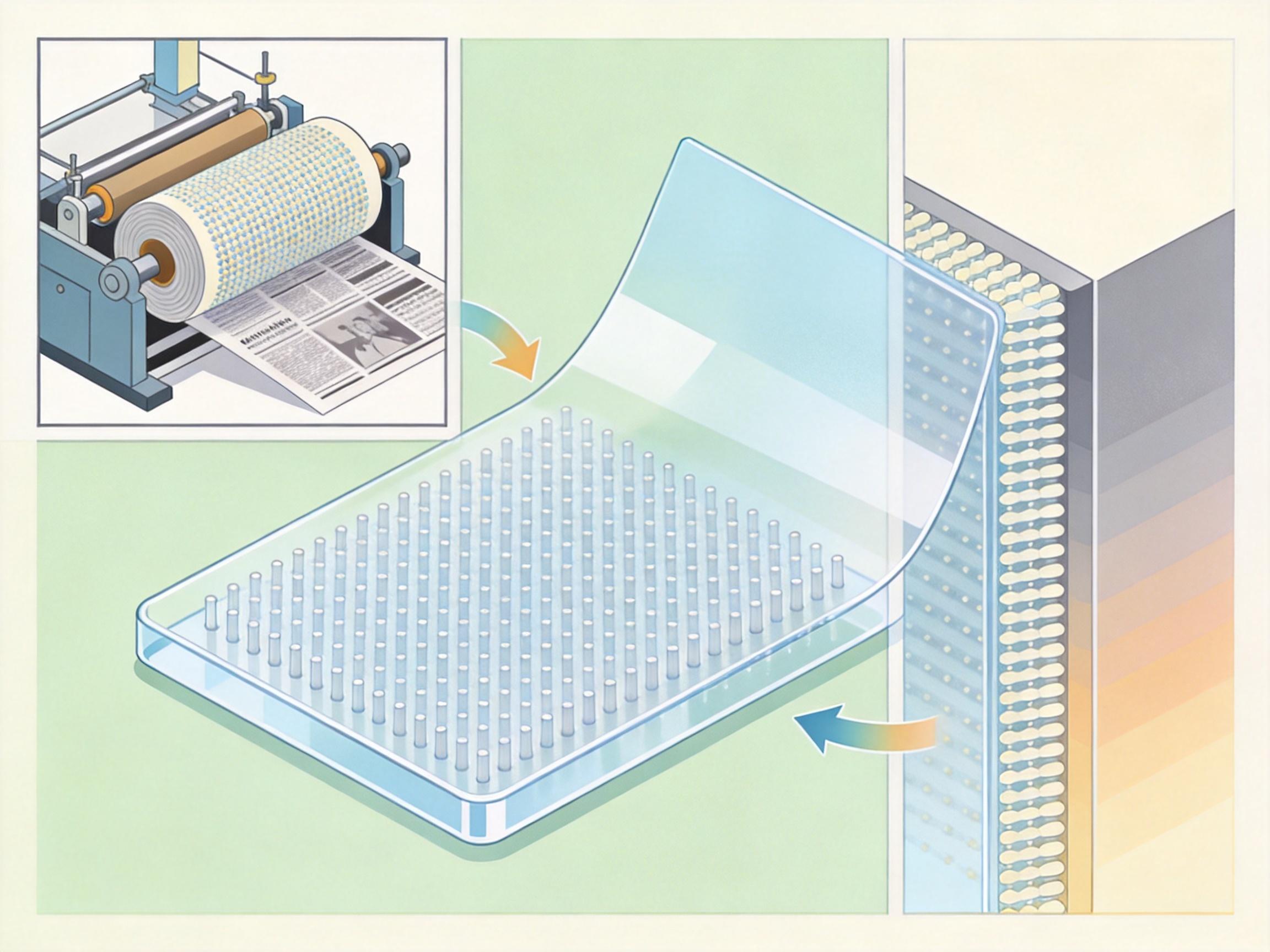和之前用金属或硅做的抗病毒表面不同,这次的膜用的是廉价的丙烯酸塑料,也就是我们常见的有机玻璃材料。更关键的是,它能用成熟的卷对卷纳米压印技术生产——就像印刷厂印报纸一样,把纳米柱的图案批量“印”在塑料薄膜上,成本低到可以忽略不计。