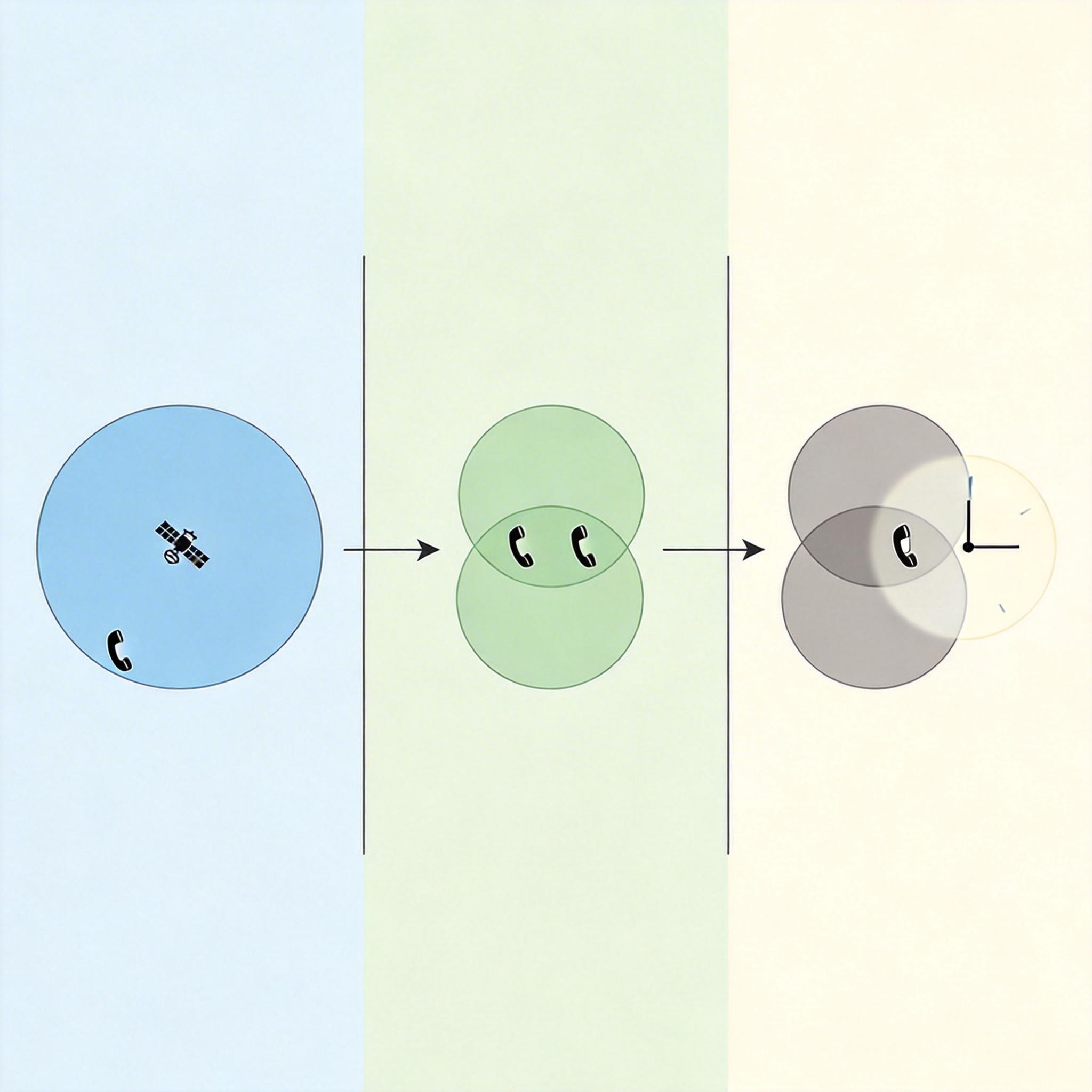 你可以把GPS卫星想象成24个挂在天上的“精准秒表”,它们每秒都在向地球广播自己的位置和当前时间。你的手机接收到信号后,会先算一个最简单的算术题:信号从卫星飞到手机用了多久?把这个时间乘以光速(约30万公里/秒),就能得到你和这颗卫星的距离。 但单颗卫星只能给你画一个“距离圈”——你知道自己在以卫星为圆心、刚才算出的距离为半径的圆圈上,但不知道具体在哪一点。两颗卫星的圆圈会交出两个交点,三颗卫星就能把范围缩小到唯一的点。不过这里有个致命问题:你的手机时钟是便宜的石英振荡器,每天能误差几千纳秒,而1纳秒的时间误差,就会导致30厘米的定位偏差。