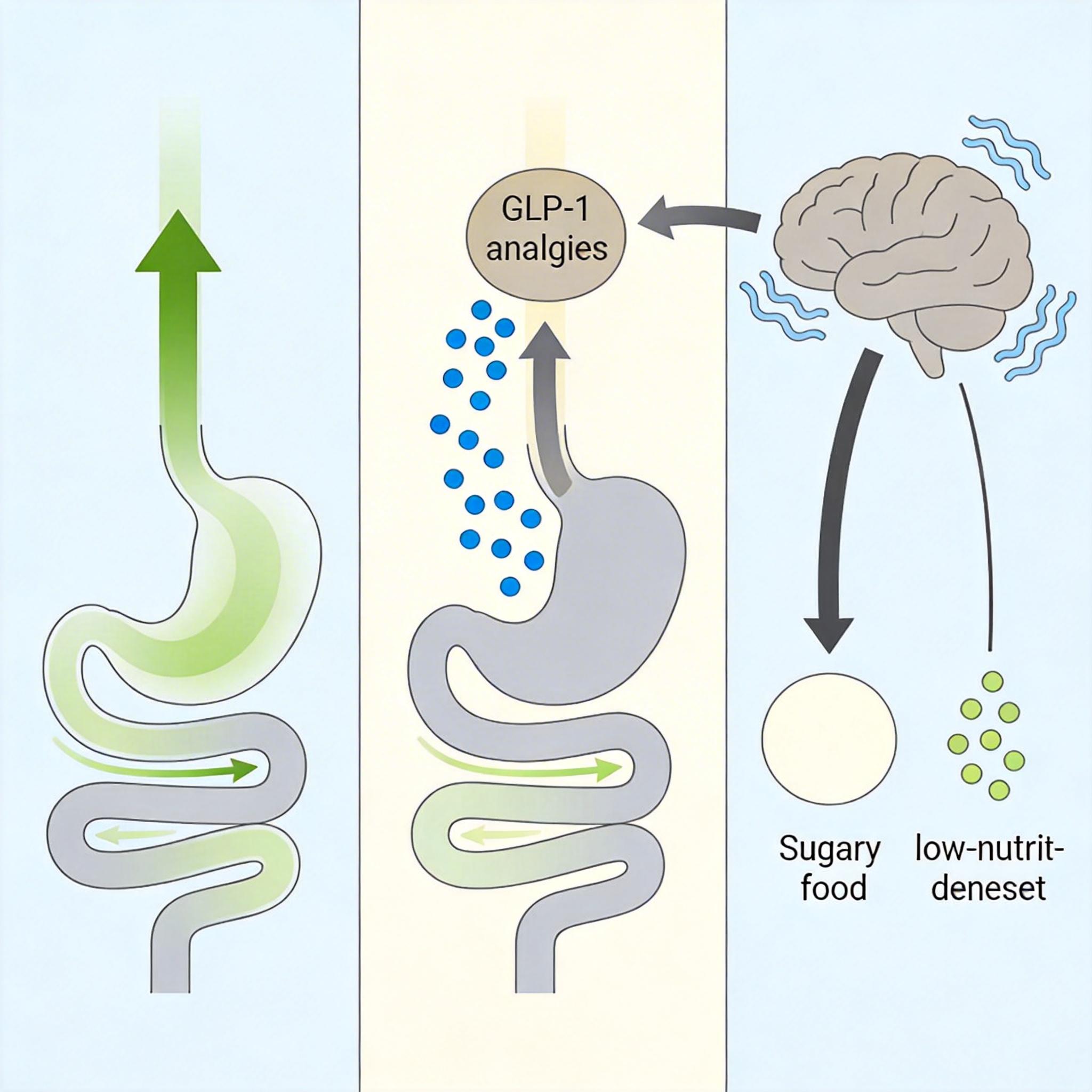 要理解这个困境,得先搞懂GLP-1的底层逻辑——它不是帮你“管住嘴”,是直接让你“不想嘴”。药物模拟肠道分泌的胰高血糖素样肽-1(GLP-1),给大脑发去“已经吃饱”的信号,同时放慢胃的蠕动速度,让饱腹感能撑更久。这就像给消化系统装了个减速阀,吃一点就顶,但身体对蛋白质、维生素的需求,和没吃药时一模一样。更棘手的是,药物带来的恶心、便秘等不适,还会进一步把人推向那些“好入口但没营养”的食物。