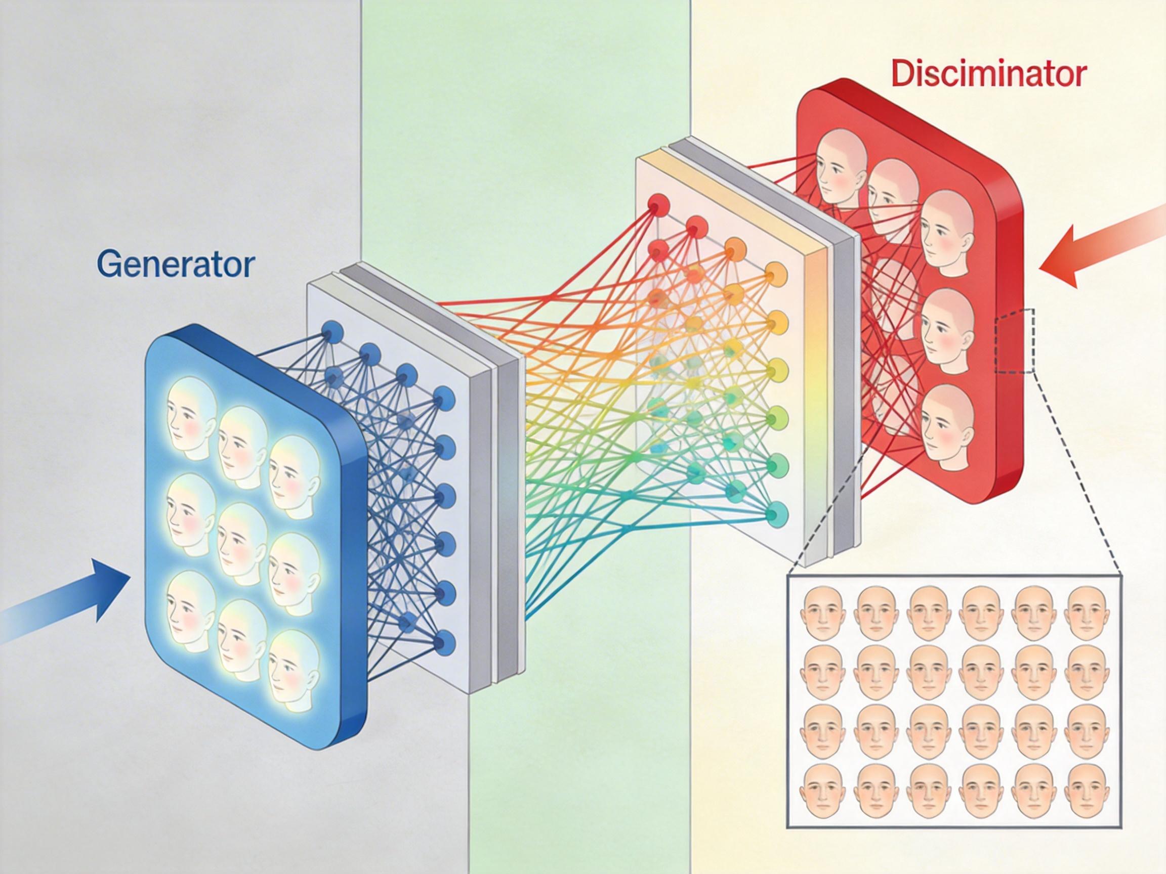 GAN就像一对互相较劲的艺术家和评委:生成器负责画假画,判别器负责分辨真假。生成器每次画完,判别器就挑毛病,生成器再改,直到判别器再也分不清真假。这种「对抗训练」让AI画的人脸能以假乱真,但也有个致命缺点——容易「模式崩溃」,比如画100张脸,看起来全是同一个人。
