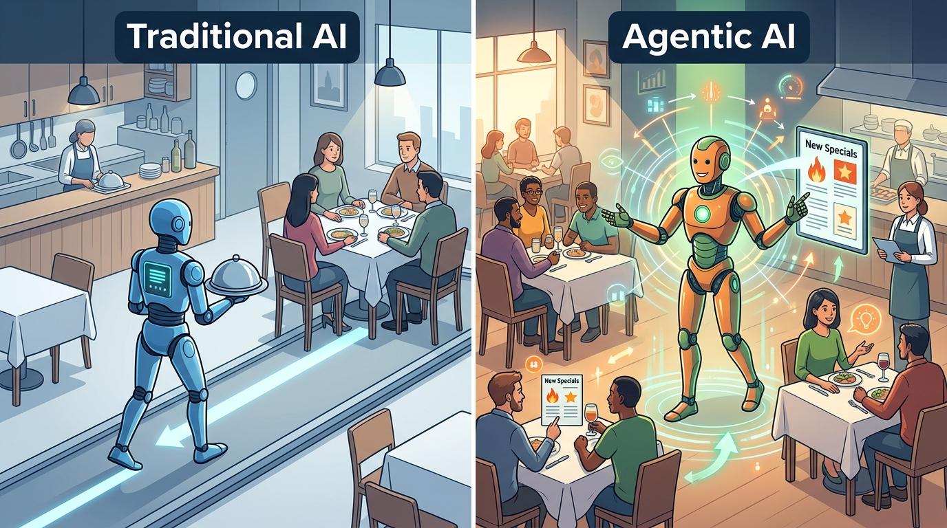 你可以把传统AI想象成餐厅里的传菜员——只会按指令把菜送到指定桌位,不会主动帮客人添水或推荐菜品。但自主行动型AI(Agentic AI)是有决策权的餐厅经理:接到“提升顾客满意度”的目标后,它会自主观察客流、调整上菜速度、培训服务员,甚至临时推出优惠活动。
