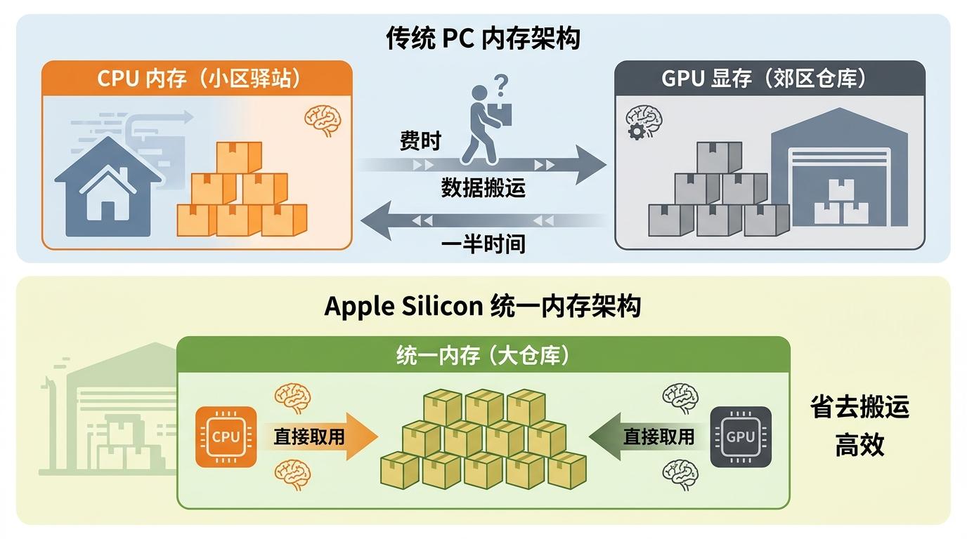 你可以把传统PC的内存结构想象成两套独立的快递站——CPU的内存是小区驿站,GPU的显存是郊区仓库,每次AI计算都要把数据从驿站搬到仓库,算完再搬回来,光赶路就耗掉一半时间。而Apple Silicon的统一内存架构,是把两个快递站合并成一个大仓库,CPU和GPU随时能取到同一份数据,彻底省掉了搬运的功夫。