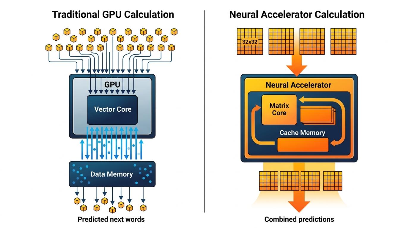 大语言模型生成文本的本质,就是做无数次矩阵乘法:把每个字的向量和模型里的权重矩阵相乘,算出下一个字的概率。传统GPU用向量核心做乘法,就像用铁锹挖土方,一锹一锹慢且费力;而神经加速器是用挖掘机,直接把32×32的矩阵块整个塞进硬件里计算,还能把中间结果存在核心内部的缓存里,不用反复去内存里取数据。