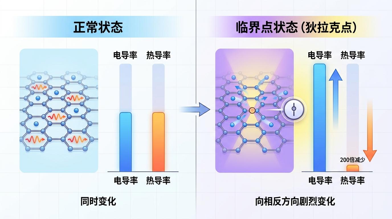 原本应该同升同降的两个数值,开始朝着相反的方向狂奔:当他们把电子数量调到一个精准的临界点——狄拉克点,石墨烯既不是金属也不是绝缘体的状态,电导率突然飙升,热导率却骤降了200倍。
