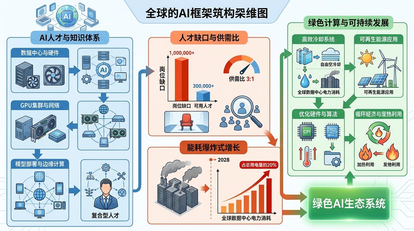 但热闹背后也藏着隐忧。全球AI相关岗位的缺口已经超过100万,其中懂基础设施的复合型人才供需比达到3:1——不是没人想入行,是这套体系太复杂:从数据中心的冷却系统,到GPU集群的网络拓扑,再到模型的边缘部署,每一层都需要跨学科的知识。而且AI基础设施的能耗正在爆炸式增长,2028年全球数据中心的电力消耗可能占到总用电量的20%,绿色计算已经不是选择题,是必答题。