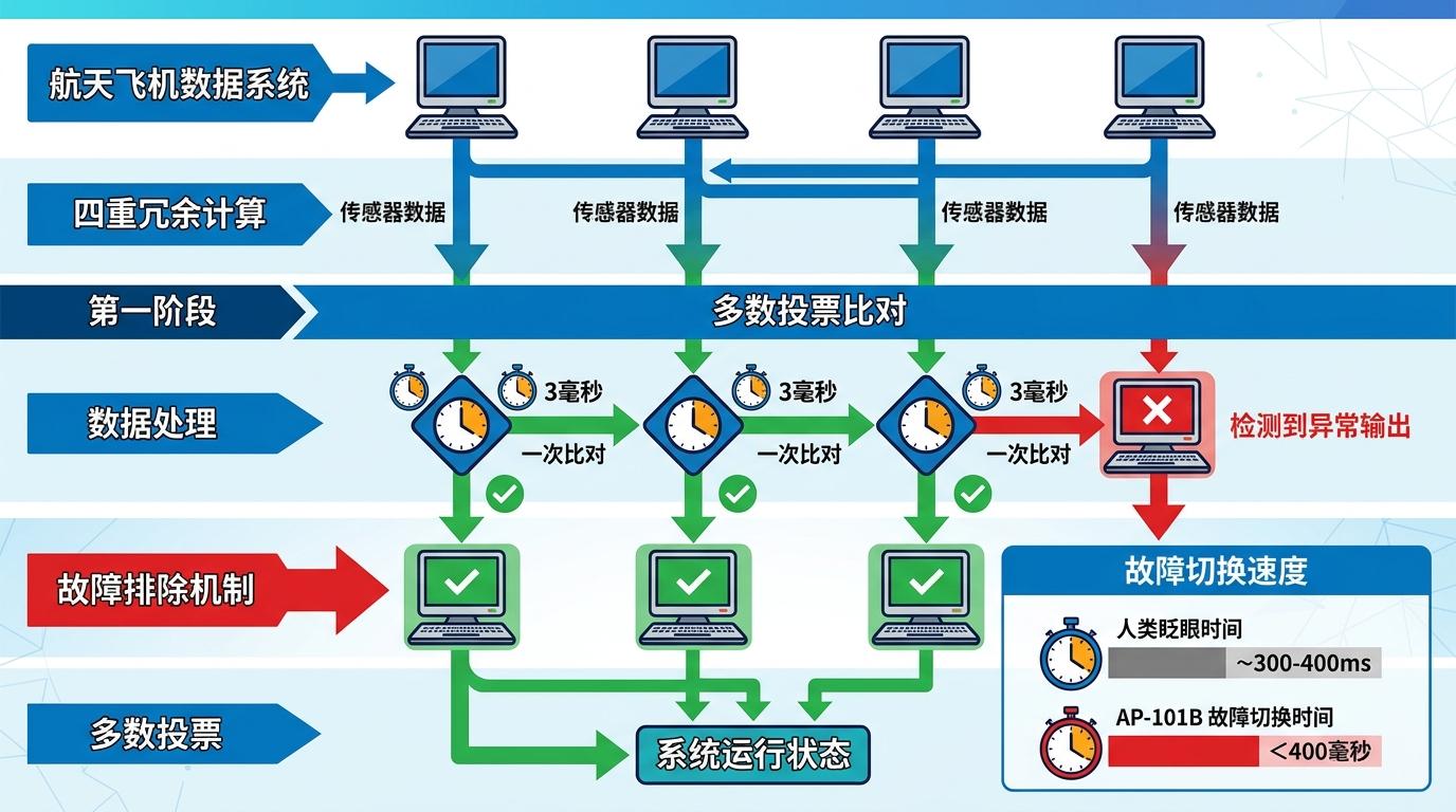 航天飞机的四台AP-101B计算机会同时处理完全相同的传感器数据,每3毫秒比对一次结果。如果其中一台输出异常,另外三台的“多数投票”会直接将其排除,系统在400毫秒内就能完成故障切换——这个速度比人类眨眼还快。