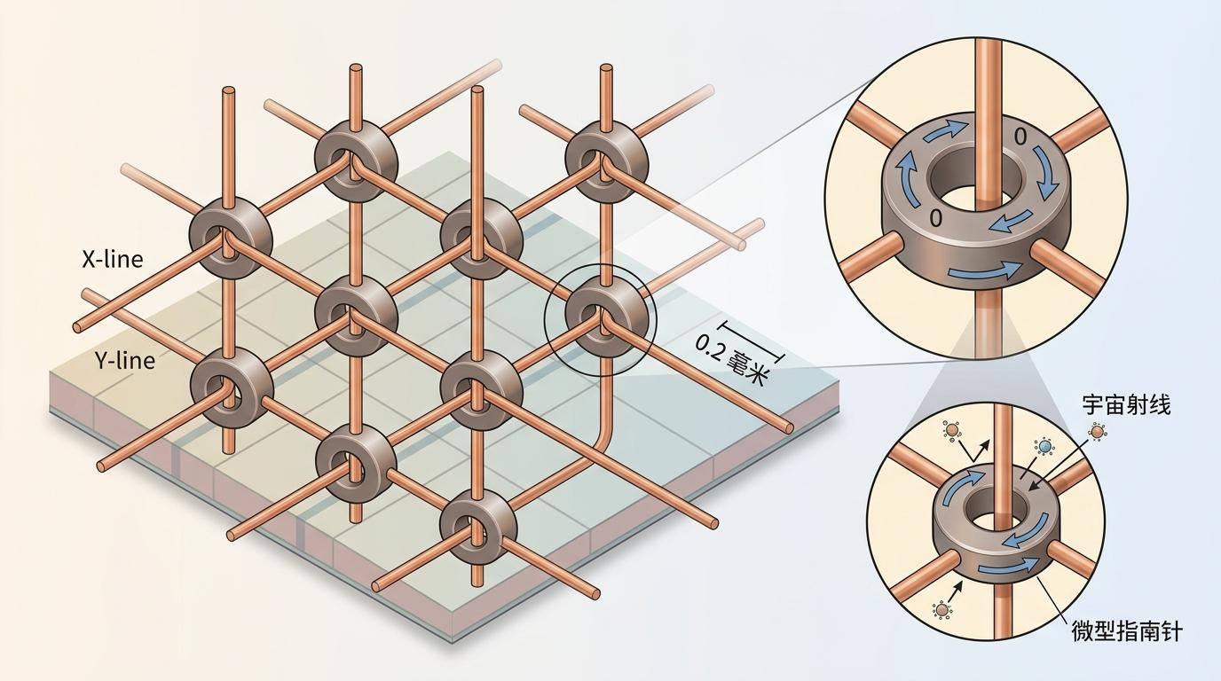 你可以把磁芯存储器想象成一群微型指南针——每颗直径仅0.2毫米的铁氧体磁环,像戒指一样穿在铜丝网格上,磁化方向代表0或1。和今天的半导体内存不同,磁芯存储器不依赖电荷,断电后数据也不会消失,更能硬扛宇宙射线的轰击。