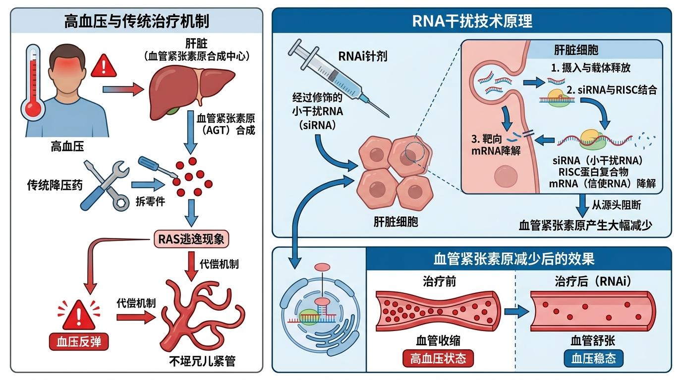 这种针剂的核心,是瞄准了肝脏里的血管紧张素原——它就像血压调节链条的「总开关」,传统降压药大多是在链条中间「拆零件」,时间久了身体会启动「代偿机制」,让药效打折扣,也就是医生说的「RAS逃逸」。而RNA干扰技术直接「掐断」了总开关的电源:用经过修饰的小干扰RNA,精准找到肝脏细胞里合成血管紧张素原的信使RNA,把它降解掉。相当于从源头减少了让血管收缩的原料,自然能让血压稳下来。