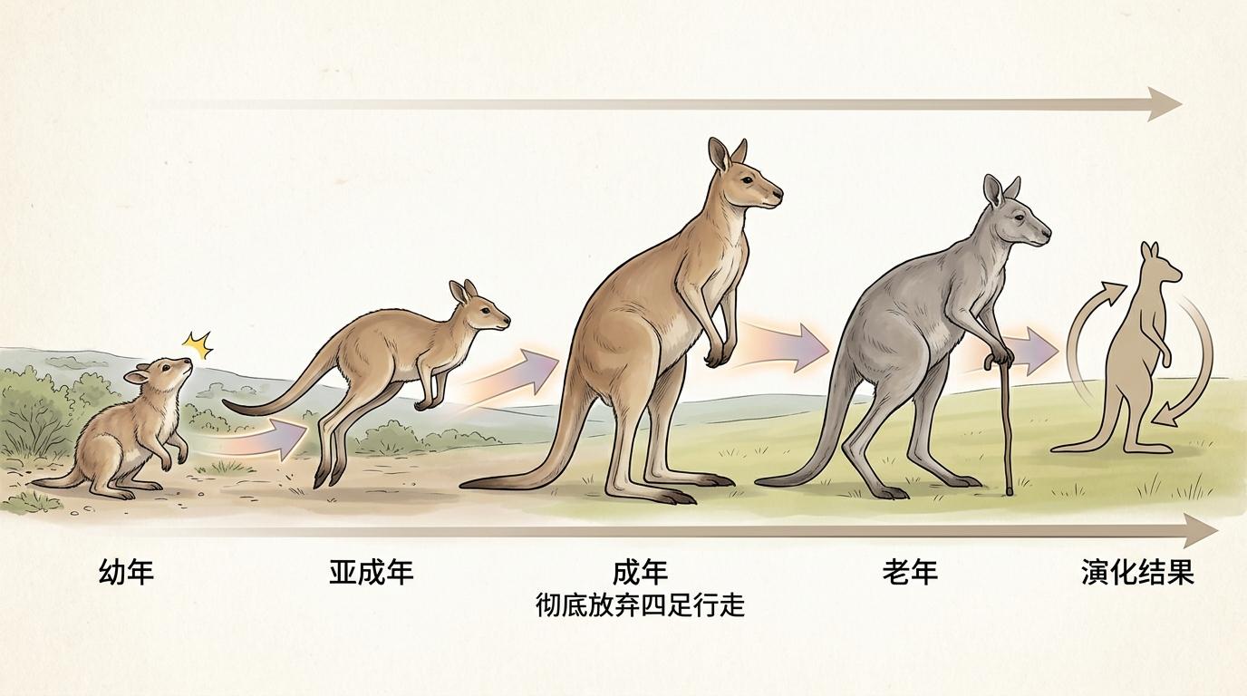 幼年个体体型小,只有贵宾犬大小,是食物链的底层。四足行走让它在茂密的灌木丛里更灵活,不容易被天敌发现,也能更稳地爬树觅食。而成年个体体型增大,天敌变少,需要更大的活动范围寻找食物,二足行走的效率优势就体现出来了——同样的能量消耗,二足行走能比四足多走30%的距离。