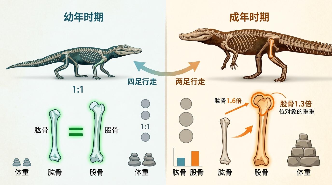 研究团队分析了950块来自至少36个个体的化石,终于拼出了这只古鳄的成长轨迹:幼年时,它的前肢肱骨和后肢股骨长度几乎相等,比例接近1:1,典型的四足行走配置。但随着体型增大,股骨的生长速度突然飙升,成年个体的股骨长度是肱骨的1.6倍,而且股骨近端的宽度增长速度是体型的1.3倍——这意味着后肢不仅更长,还能承受更大的体重。