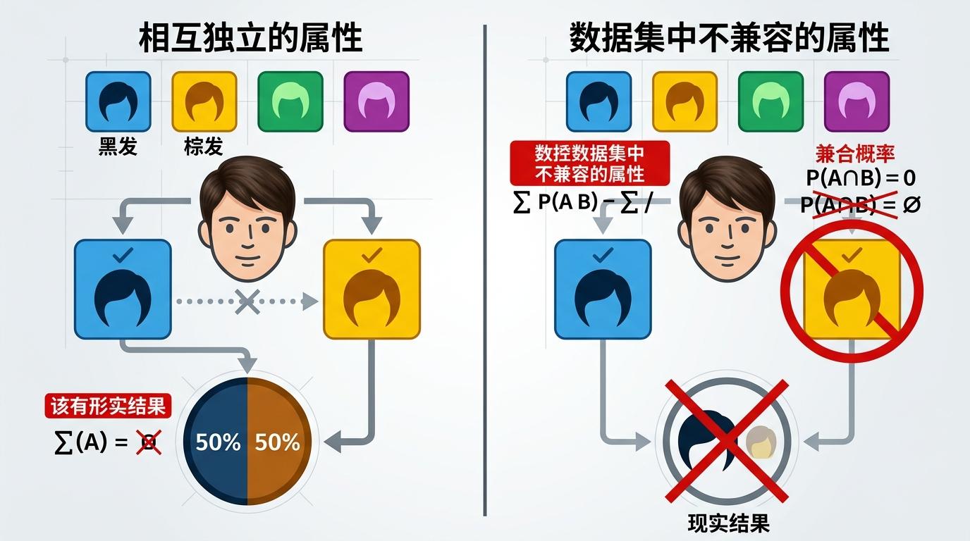 为什么偏偏是这两个属性?答案藏在数据集和损失函数的矛盾里:在真实世界中,一个人的头发不可能同时是黑色和棕色,但模型的损失函数默认这40个属性是相互独立的。当照片里的头发颜色因光线模糊时,模型会给“黑发”和“棕发”各打50%的概率,损失函数会把这解读为“25%概率同时是黑棕发”——但这在现实中不可能发生。