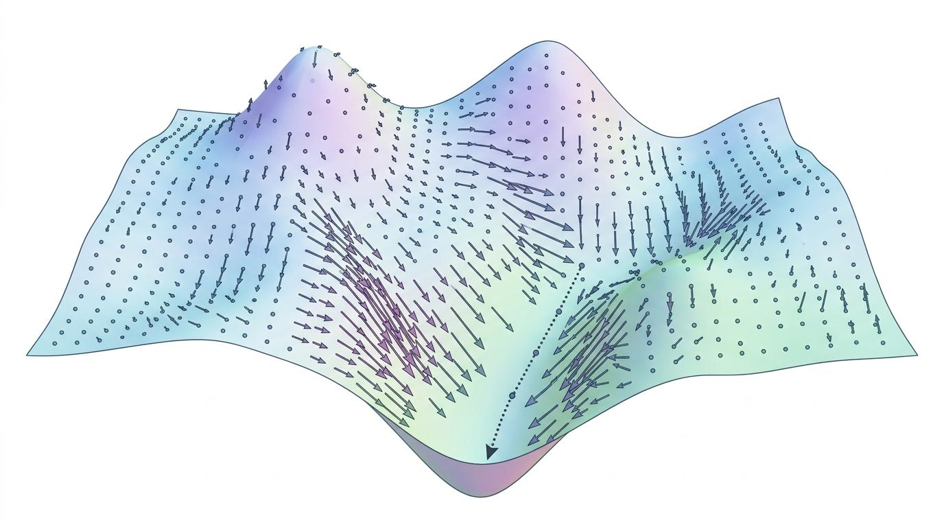 你可以把神经网络的参数空间想象成一片布满箭头的荒野——每个训练样本就是一个指向特定方向的箭头,它会“推”着模型参数往降低损失的方向挪一步。这个由样本定义的“箭头场”,在数学上叫向量场(vector field),对应每个样本的负梯度:$v^{(x)}(\theta) = -