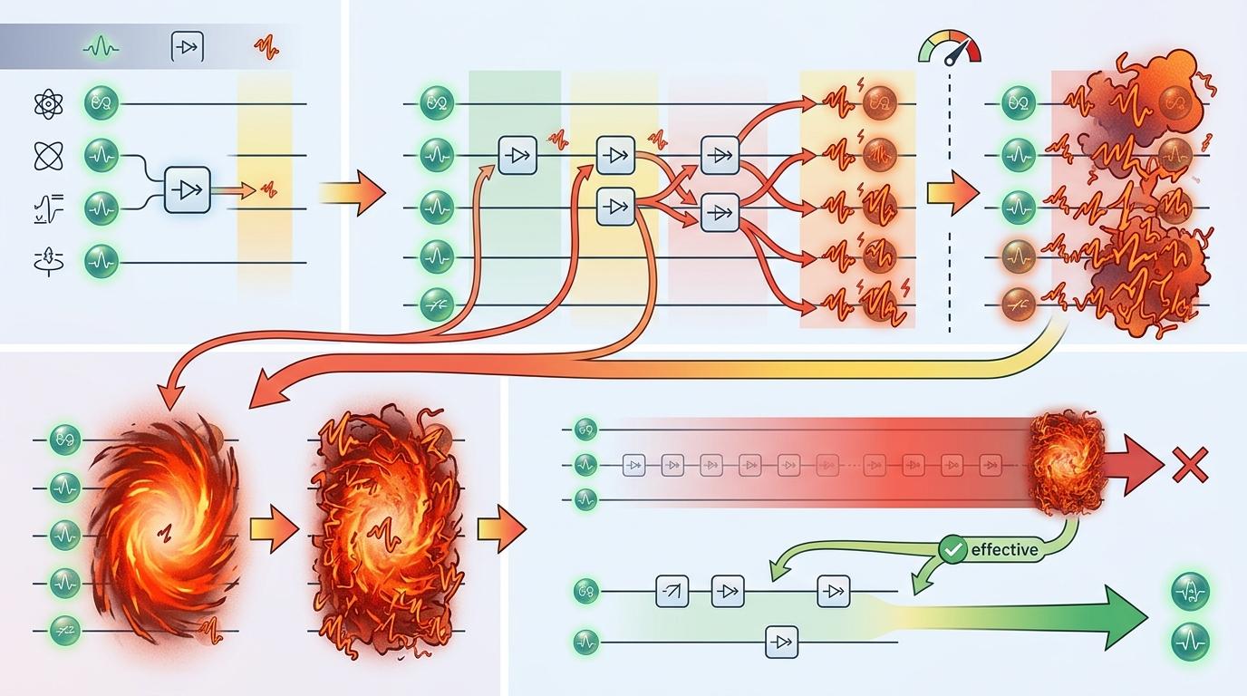 研究团队用数学模型追踪了噪声在量子电路里的传播:每完成一次操作,噪声就会在量子比特上留下一点误差。当电路深度超过某个阈值(大约是量子比特数的对数级别),早期操作的误差会指数级放大,最终完全淹没初始信息。原本设计了100层操作的深电路,实际效果只相当于最后10层的浅电路——前面90层的计算,全成了无效功。