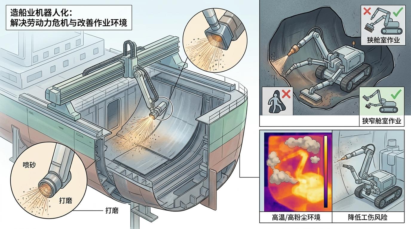 推动这场变革的直接原因,是美国造船业的劳动力危机。目前行业熟练工人的年流失率超过30%,年轻工人入职半年内的离职率甚至接近60%,高薪也填不上这个缺口。而打磨、喷砂这些最苦的岗位,恰恰是船体制造中无法跳过的环节——过去靠工人硬扛,现在靠机器人接棒。更关键的是,这些机器人能进入人类无法立足的狭窄舱室,或是在高温、高粉尘的环境下连续作业,从根源上降低了工伤风险。