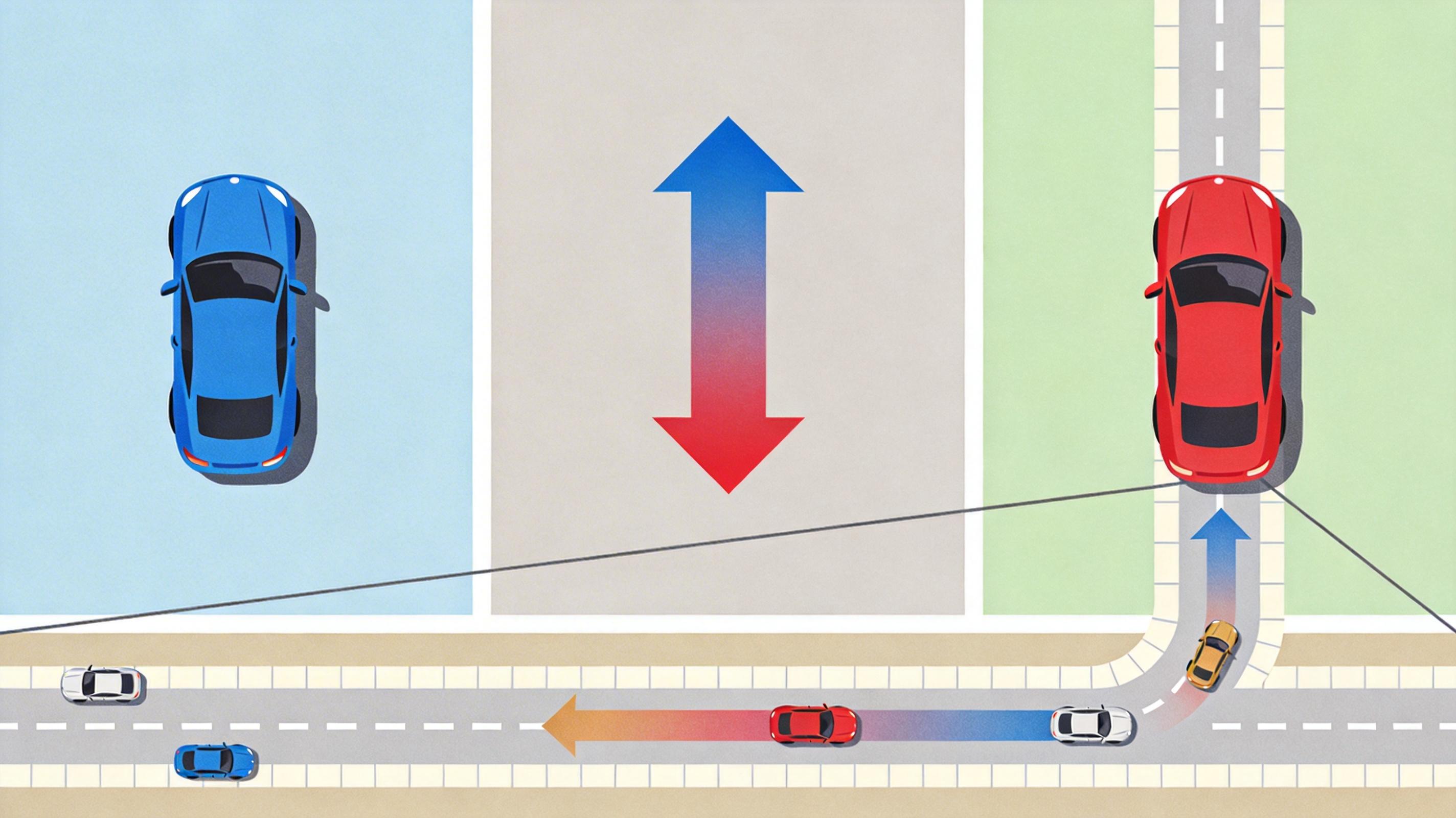 现代游戏里,碰撞检测可能会用上空间划分、物理引擎,甚至机器学习预测,但原版直接用了O(n²)的暴力解法——每辆车都要和其他所有车检查会不会撞上。但它加了一个关键的“早退”逻辑:先看对方的行驶方向,因为道路都是单向的,往东走的车和往西走的车根本不可能在同一条路上,直接跳过检查;同方向的车再看是不是在同一条车道,不是也直接跳过。最后真正需要算坐标的,往往只有寥寥几对。