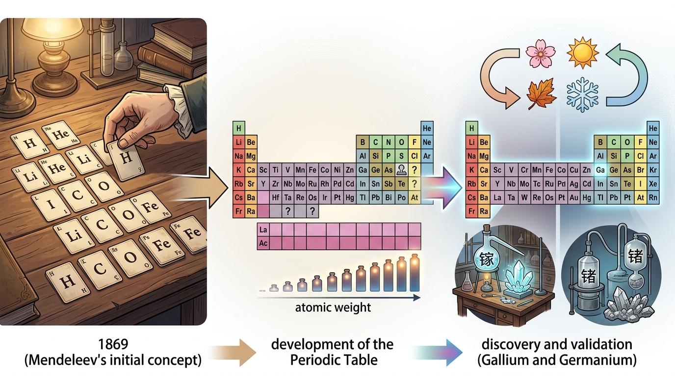 1869年,门捷列夫在扑克牌上写下元素符号,像洗牌一样排列出规律。他大胆留下空位,预言了「类铝」「类硅」的存在——当镓和锗在十几年后被发现,性质与预言分毫不差时,整个科学界为之震动。这张表第一次证明:物质的世界有迹可循,元素的性质会随着原子量的递增,像四季一样周而复始。