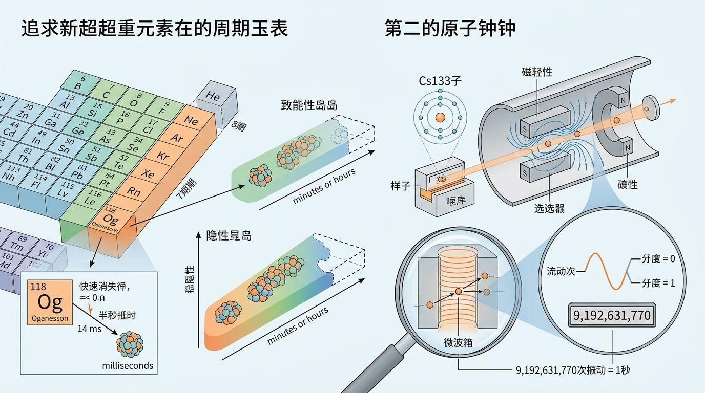 如今的周期表已经走到了第118号元素Og,那个在加速器里只存在千分之一秒的超重原子。科学家还在试图合成第120号元素,朝着理论中的「稳定岛」进发——那里的超重元素可能拥有更长的寿命,足以让我们摸到周期表的物理极限。但这张表的意义从不是填满空格,它是一把尺子,让我们能预测未知元素的性质,设计从未有过的材料,甚至重新定义时间:铯原子钟的一秒,就是铯-133原子振动9192631770次的时长。