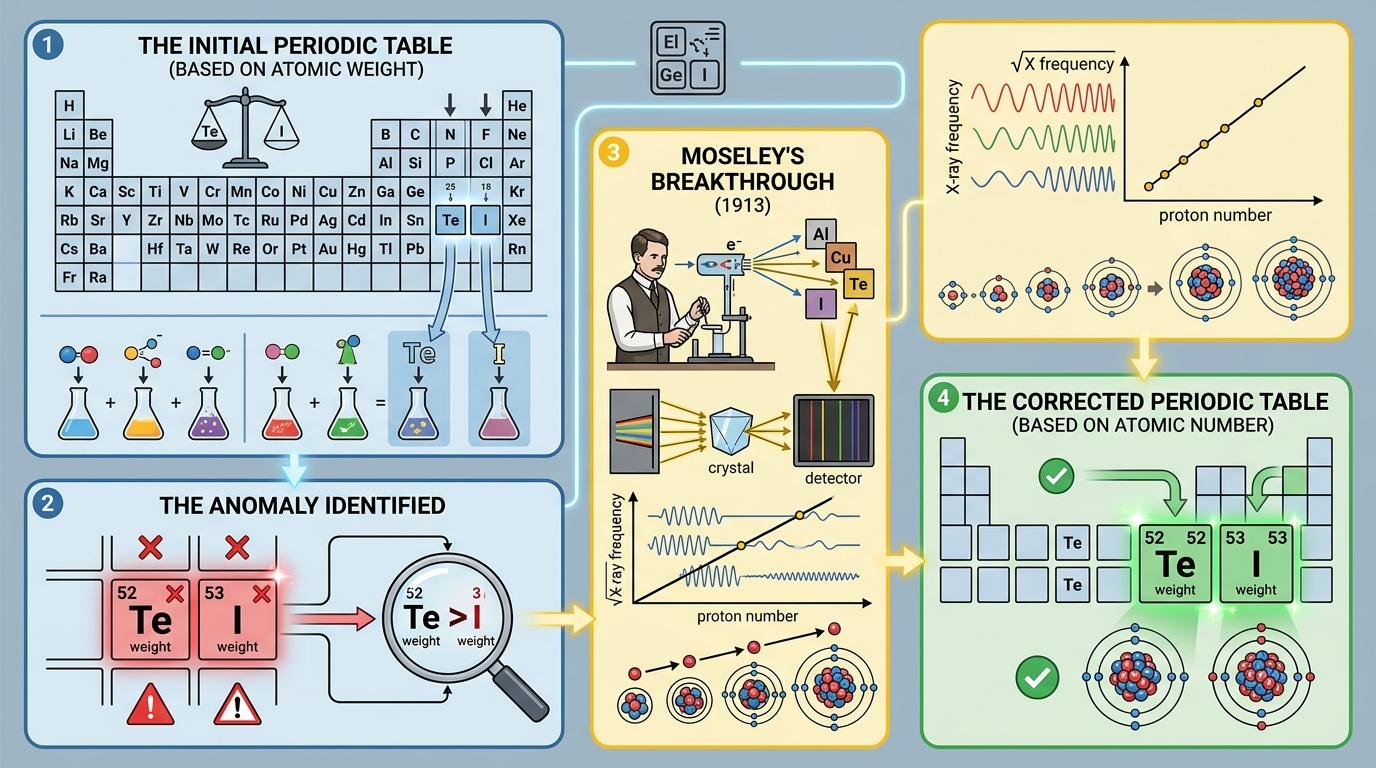 但自然不在乎我们的假设。门捷列夫的表格里,碘的原子量比碲小,却被放在了碲的后面——为了让化学性质相似的元素归为一族。直到1913年,莫斯利用X射线敲开了原子核的门:决定元素身份的不是原子量,是原子核里的质子数,也就是原子序数。这才补上了周期表最后一块理论拼图,让碘和碲的位置终于名正言顺。