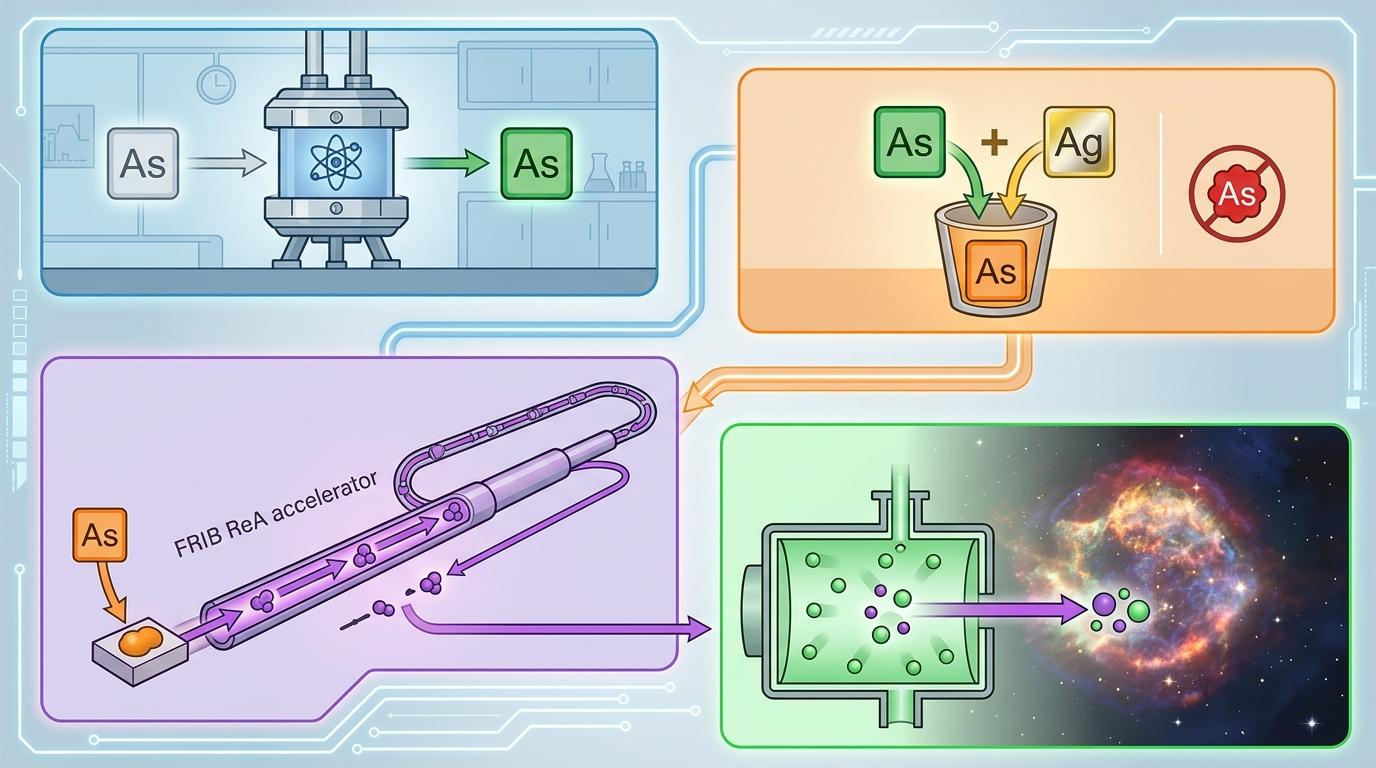 你可以把整个过程想象成一场精密的“宇宙复刻”:科学家先靠核反应造出砷-73同位素,再把它做成银砷化合物——这是个关键创新,解决了砷元素在离子源里容易挥发的难题。接着用FRIB的ReA加速器把砷-73离子加速到高能,射进充满氢气的靶室里。氢气里的质子,就是超新星里随处飘的“原料”。