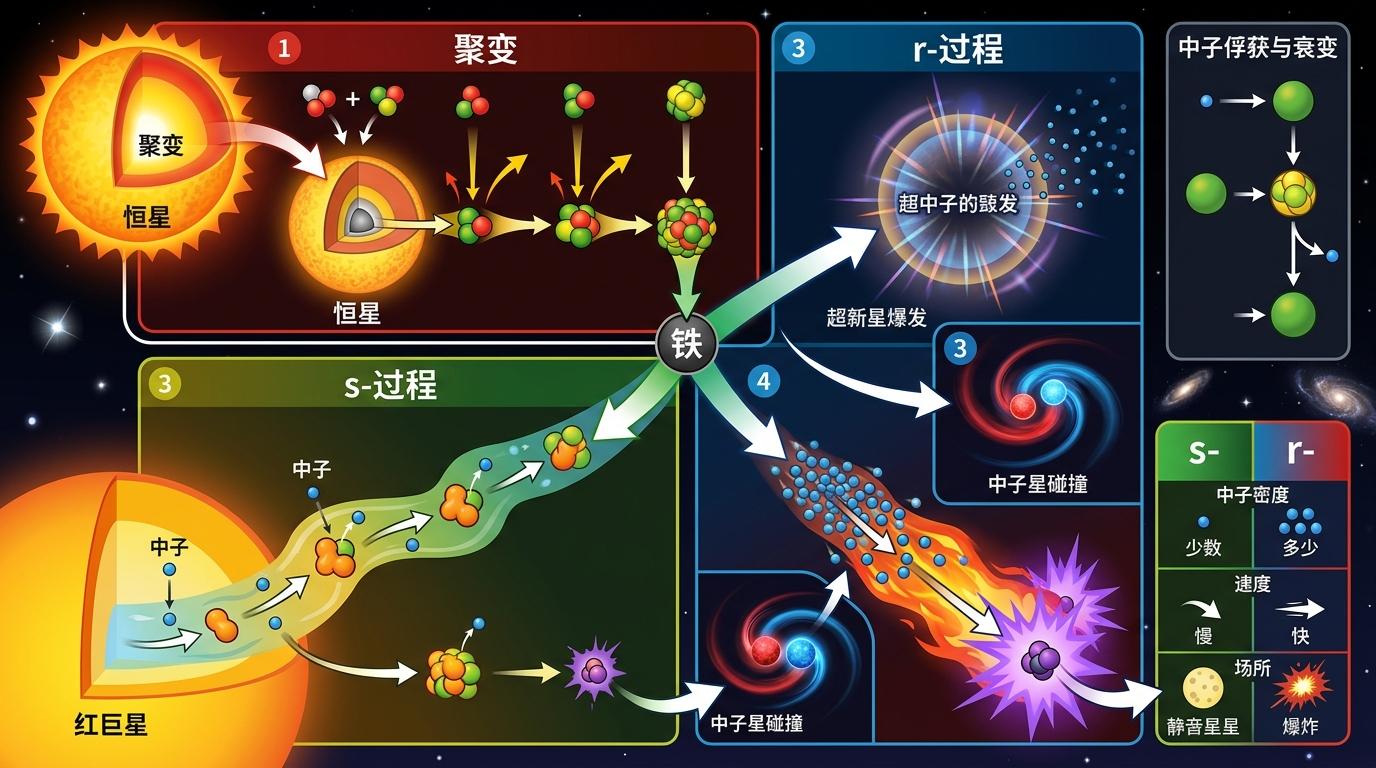 要理解p-核素的特殊,得先搞懂宇宙造元素的常规流程:比铁轻的元素靠恒星内部的核聚变,比铁重的则靠“中子俘获”——就像串糖葫芦,原子核一个个粘住中子,再通过衰变变成稳定元素。慢中子俘获(s过程)在红巨星里慢慢发生,快中子俘获(r过程)则是中子星碰撞、超新星爆发时的“闪电操作”。