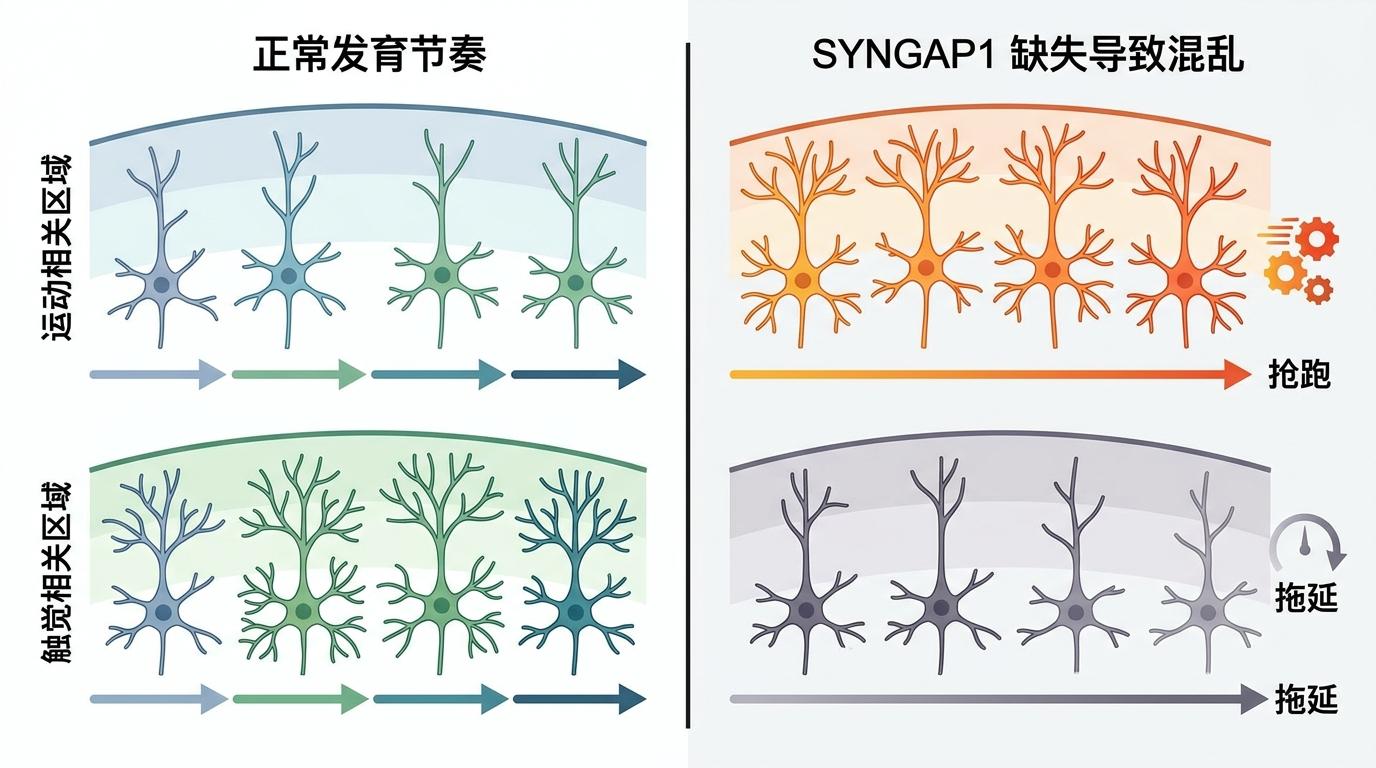 最近一项小鼠研究终于揭开了这个矛盾的根源:当SYNGAP1基因功能缺失时,大脑神经回路的发育节奏被彻底打乱,一部分区域成熟得太快「提前罢工」,另一部分却始终处于「过度加班」的亢奋状态。为什么一个基因的缺失会制造出如此分裂的大脑?这背后藏着神经发育最核心的秘密。