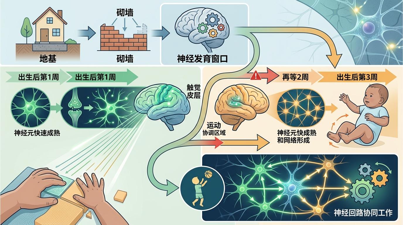 要理解这种分裂,得先搞懂大脑的「发育窗口」——就像盖房子要先打地基再砌墙,大脑不同区域的神经元也有自己固定的成熟时间表。比如负责触觉的皮层区域会在出生后第一周开始快速成熟,而负责运动协调的区域则要慢两周。这种「错峰发育」是神经回路最终能协同工作的关键。