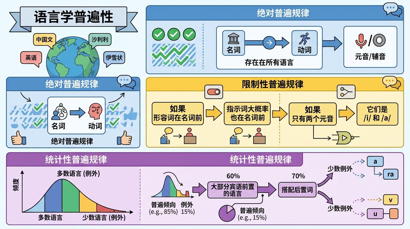“语言学普遍性”是语言学家用来描述全球语言共性的核心概念——简单说,就是那些不管你说汉语、斯瓦希里语还是因纽特语,都可能存在的语法特征。它分为三类:绝对普遍规律是所有语言都绕不开的铁则,比如任何语言都有名词和动词;限制性普遍规律是“有A必有B”的条件关联,比如“如果形容词在名词前,那指示词大概率也在名词前”;统计性普遍规律则是多数语言遵循但允许例外的倾向,比如大部分宾语前置的语言会搭配后置词。