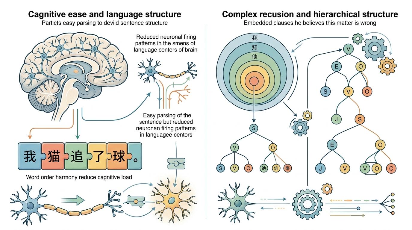 那些被证实的普遍规律,本质上都是人类认知和交流需求妥协的结果。从认知层面看,语言结构必须适配人类大脑的处理能力:比如“词序和谐”能减少理解时的认知负担,让我们不用反复调整解析逻辑;层级结构则是为了满足复杂思维的表达需求——没有递归嵌套的语法,我们没法说出“我知道你觉得他认为这件事不对”这样的句子。