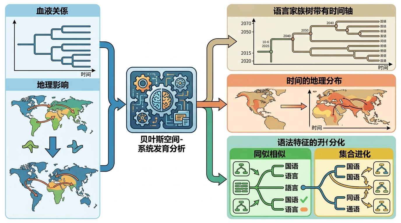 让这项研究突破瓶颈的,是一种叫“贝叶斯空间-系统发育分析”的方法——它能同时兼顾语言的“血缘关系”和地理影响,彻底解决了传统研究的统计偏差问题。简单来说,它像给语言画了一张带时间轴的“家族树”,再叠加地理分布图层,以此区分“因为同源而相似”和“因为独立演化而趋同”的语法特征。