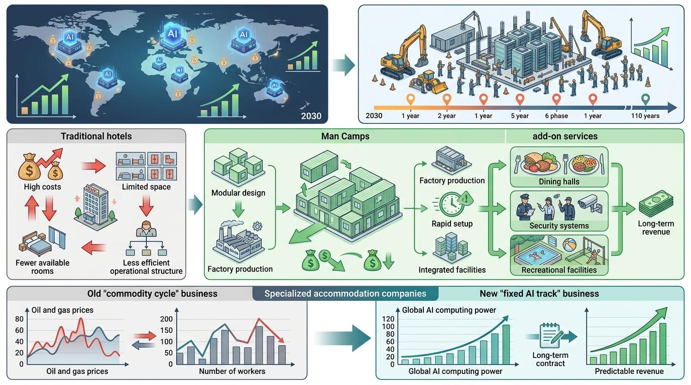 这不是偶然的跨界。全球AI数据中心的建设投资,到2030年预计突破7万亿美元,单个项目的建设期长达12到24个月,需要的工人规模堪比一场小型基建战役。传统酒店要么容量不足,要么成本高企,而Man Camps的模块化模式刚好匹配这种“大规模、长周期、可预测”的需求——它能把住宿成本压缩30%以上,还能通过餐饮、安保、娱乐等增值服务锁定长期收入。对Target Hospitality这类企业来说,这意味着从“看油气价格吃饭”的周期性业务,转向了跟着AI算力增长的确定性赛道。