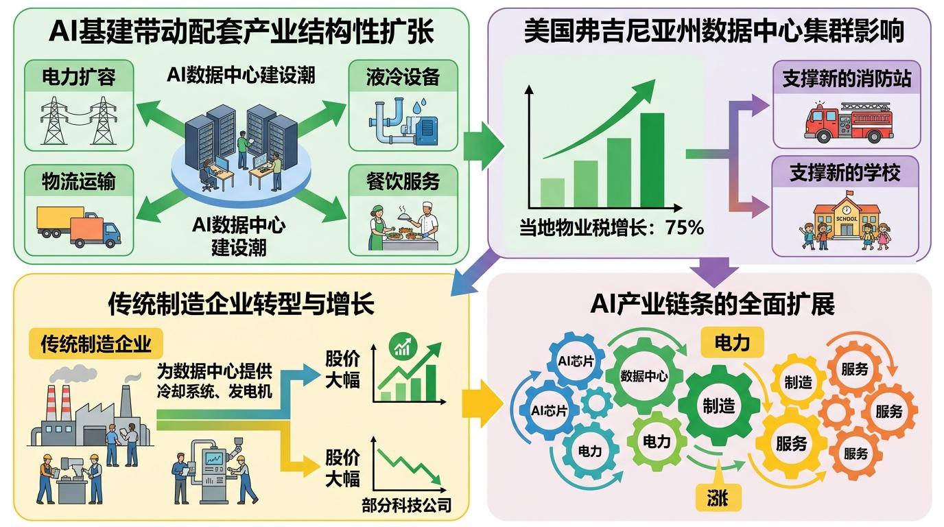 更值得注意的是,这只是AI基建带动配套产业结构性扩张的一个切面。数据中心的抢建潮,正在把电力扩容、液冷设备、物流运输甚至餐饮服务,都拉进了AI的产业链条。美国弗吉尼亚州的数据中心集群,已经带动当地物业税增长了75%,支撑起新的消防站和学校;而那些靠给数据中心做冷却系统、发电机的传统制造企业,股价涨幅甚至超过了部分科技公司。