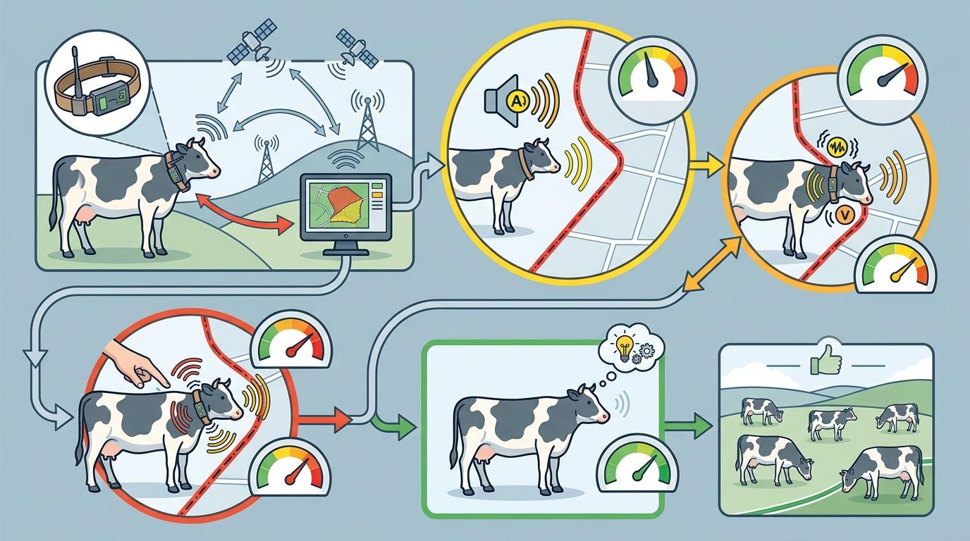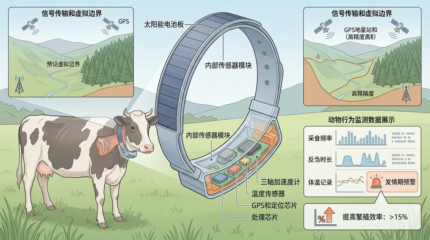 虚拟围栏的核心,是给牲畜戴上能接收信号的项圈,结合GPS定位和低频率基站,在电子地图上画出放牧禁区。当牛靠近边界,项圈先发出类似倒车雷达的提示音;如果继续越界,就会传来轻微振动——就像有人用手指轻戳它的脖子。绝大多数牛在三次接触后就能记住规则,此后只靠声音就能约束行动,全程无需人力介入。