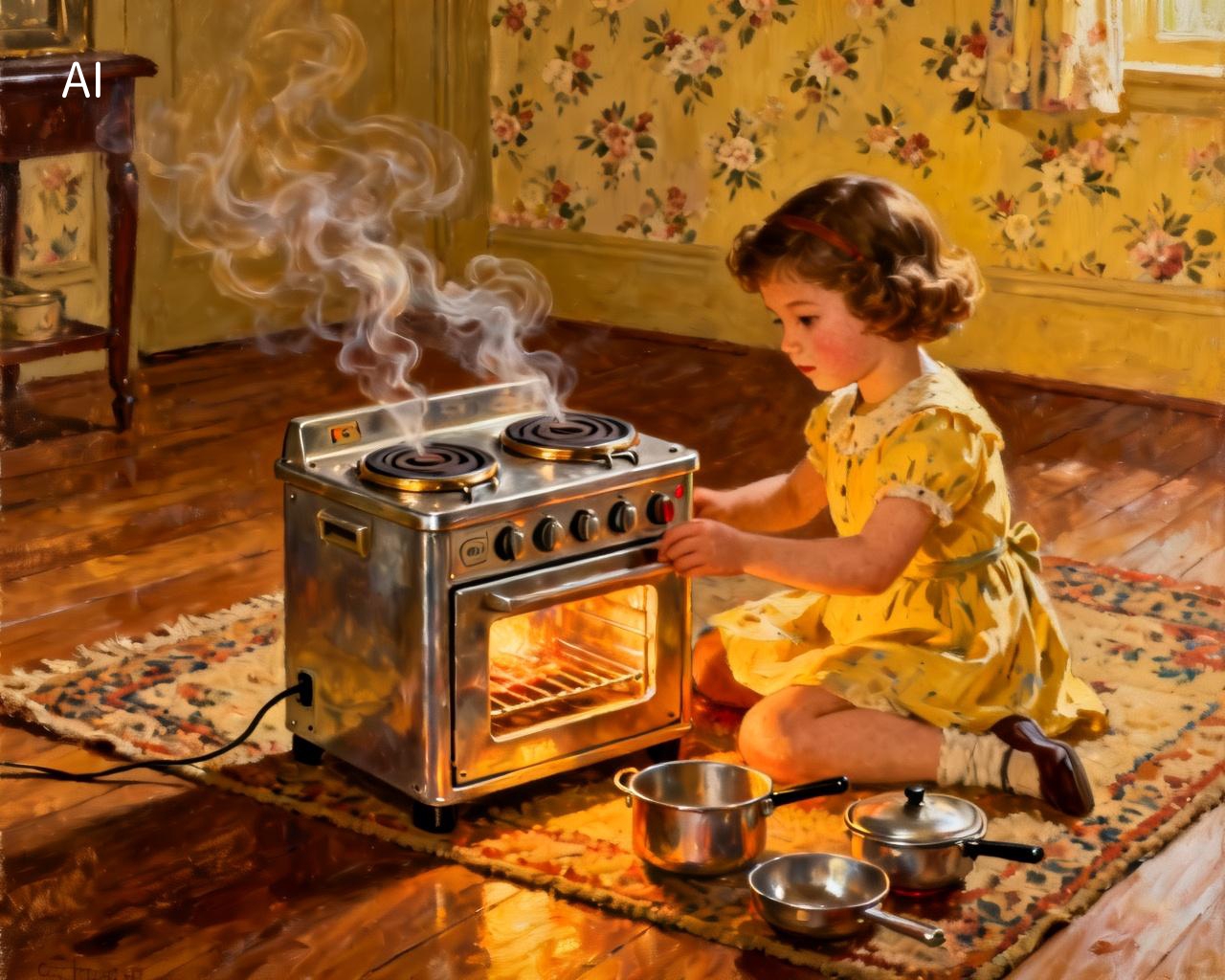 这并非孤例。早在19世纪中期,用煤炭或酒精加热的铸铁玩具炉就已是女孩们的“教育工具”,与兄弟们的玩具蒸汽机对应,划分出泾渭分明的性别领域。然而,莱昂内尔玩具炉的出现,标志着一个新时代的来临:电力,这项重塑世界的力量,正以一种微缩、精致甚至危险的方式,开始塑造家庭的未来、权力的分配,以及两性之间的角色脚本。 一个小小的玩具炉,如何成为一面棱镜,折射出科技、家庭与性别角色近一个世纪的角力与演变?