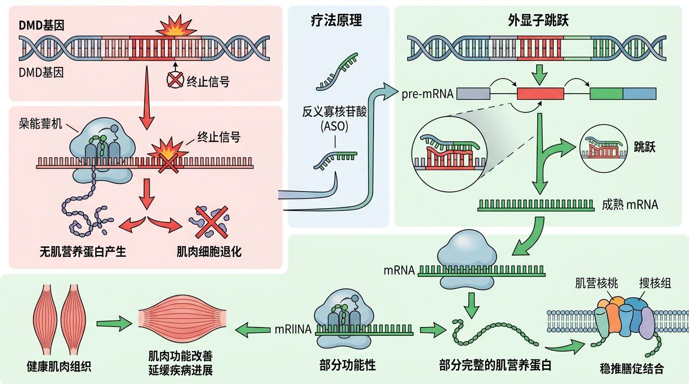 外显子跳跃疗法是他们唯一的光——这个听起来像文字游戏的技术,本质是用一段人工合成的反义寡核苷酸,像给错误的句子删去错字一样,跳过DMD基因里那个突变的外显子,让细胞能读出半完整的肌营养蛋白指令。就像把一本缺了页的书,跳过破损的章节,好歹能读下去,而不是直接变成废纸。