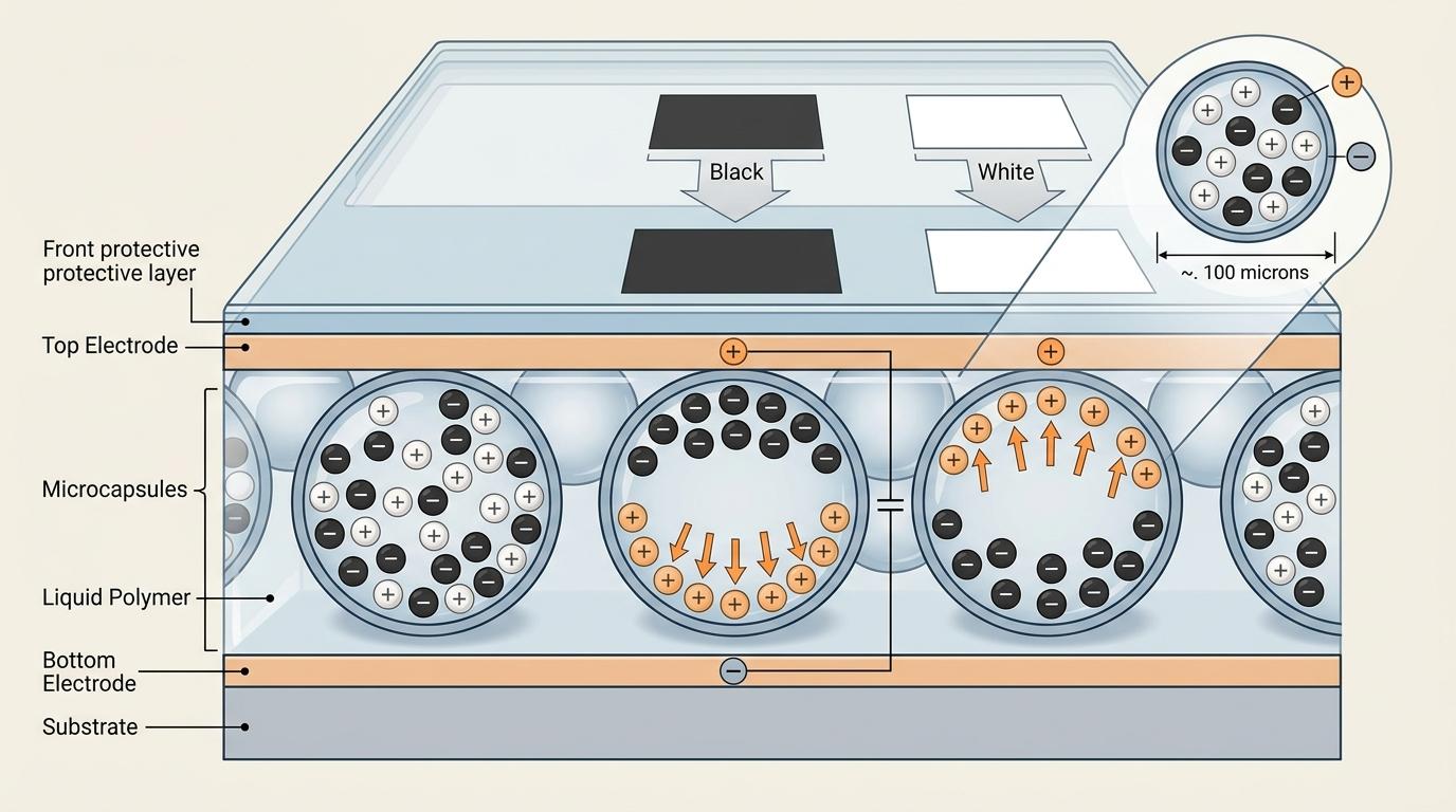 如果说NFC是徽章的「心脏起搏器」,那电子墨水屏就是它能「不喘气也干活」的关键。你可以把电子墨水屏想象成一贴带磁铁的贴纸:屏幕里有数百万个微胶囊,每个胶囊里都装着带正电的白色粒子和带负电的黑色粒子。当你给屏幕通电时,这些粒子会像被磁铁吸引一样移动,白色粒子跑到胶囊顶部就是白色,黑色粒子上来就是黑色。