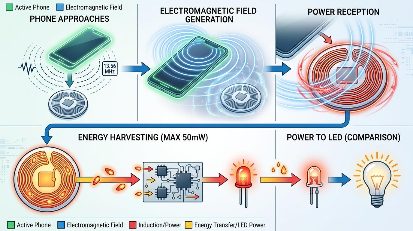 你可以把被动NFC(近场通信)想象成一个「隔空借电」的魔术:当你的手机靠近徽章时,会发出一个13.56MHz的高频电磁场,徽章上的NFC天线就像一个微型发电机,从这个电磁场里「偷」出一点点能量——最多不过50毫瓦,差不多是一颗LED小灯的功率。