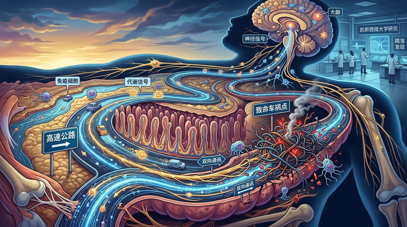 你可以把肠道和大脑的关系想象成一条藏在身体里的秘密高速公路——这就是肠脑轴,一个由神经、免疫和代谢信号组成的双向通讯网络。过去我们只知道它能传递“我饿了”“我紧张”这类简单信号,但凯斯西储大学的研究团队,第一次精准找到了这条高速路上的“致命车祸点”。