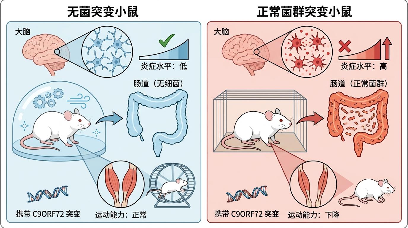 为了验证这个结论,科学家们用上了一个“秘密武器”:无菌小鼠。这些从小在完全无菌环境里长大的小鼠,体内没有任何肠道细菌。当他们把携带C9ORF72突变的无菌小鼠,和携带同样突变但有正常肠道菌群的小鼠放在一起对比时,差异一目了然——前者的大脑里几乎没有炎症,运动能力也完全正常。