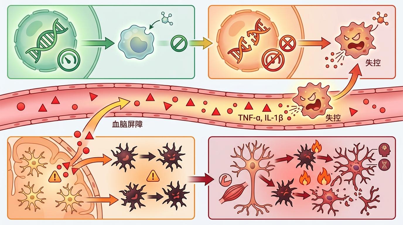 而对于携带C9ORF72基因突变的人(这是ALS和FTD最常见的遗传病因),情况会变得更糟。这个基因在免疫细胞里的作用,本来是“刹车”——控制对无害物质的过度炎症反应。一旦它出了问题,免疫细胞就会像失控的警车,对着这种细菌糖原猛踩油门:巨噬细胞疯狂释放TNF-α、IL-1β等促炎因子,这些因子顺着血液流到大脑,激活脑内的小胶质细胞,最终把负责运动和人格的神经细胞“啃食”殆尽。