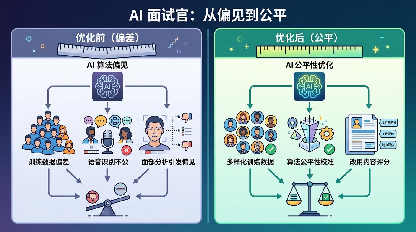 当然,机器的尺子也有刻度偏差。亚马逊曾因训练数据偏向男性,导致AI自动降低女性简历评分;HireVue的语音识别系统,也曾对非白人和听障求职者出现不公平评分。这些问题不是AI的原罪,而是训练数据和算法设计的漏洞——就像给尺子刻错了刻度,量出来的结果自然不准。如今的AI面试官已经在补这些漏洞:比如去掉面部表情分析这类容易引发偏见的功能,改用纯内容评分;定期用多样化数据训练模型,确保刻度的公平性。