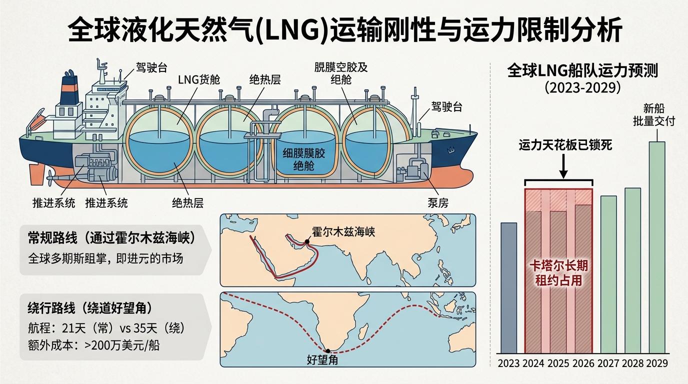 更致命的是运输环节的刚性。霍尔木兹海峡承担着全球23%的LNG运输,一旦局势紧张,船只只能绕道好望角,航程增加14天,每船额外成本超过200万美元。而全球LNG船队的订单已经被卡塔尔的长期租约占满,新船要到2029年才能批量交付——这意味着,在未来3年里,全球LNG运输的「运力天花板」已经锁死。