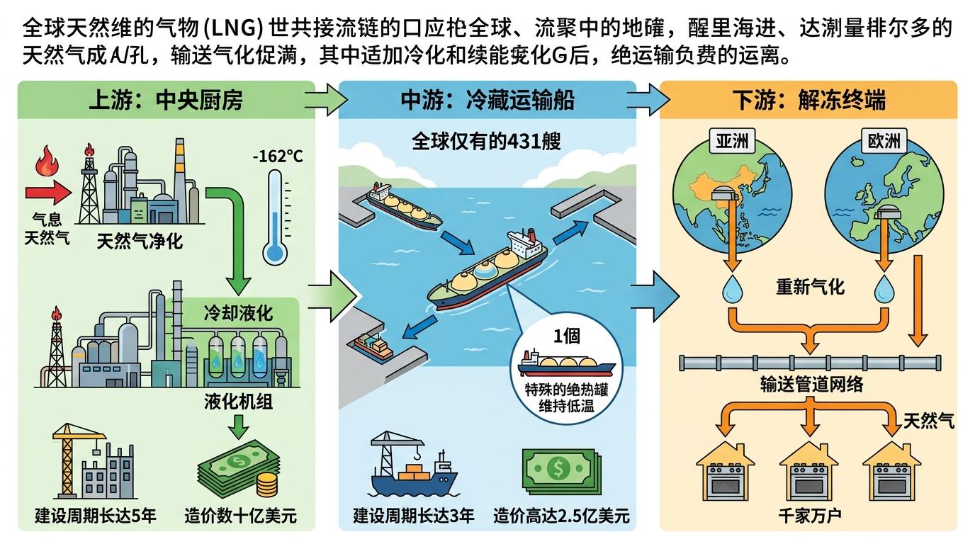 你可以把全球LNG产业链想象成一条横跨大洋的速冻食品生产线:上游是卡塔尔、美国、澳大利亚几个「中央厨房」,负责把气态天然气净化、冷却到-162℃变成液态——这个过程需要造价数十亿美元的液化机组,每台机组的建设周期长达5年。中游是全球仅有的431艘「冷藏运输船」,它们用特殊的绝热罐维持低温,一艘船的造价高达2.5亿美元,建造周期也要3年。下游则是分布在亚洲、欧洲的「解冻终端」,把液态天然气重新气化,输送到千家万户。