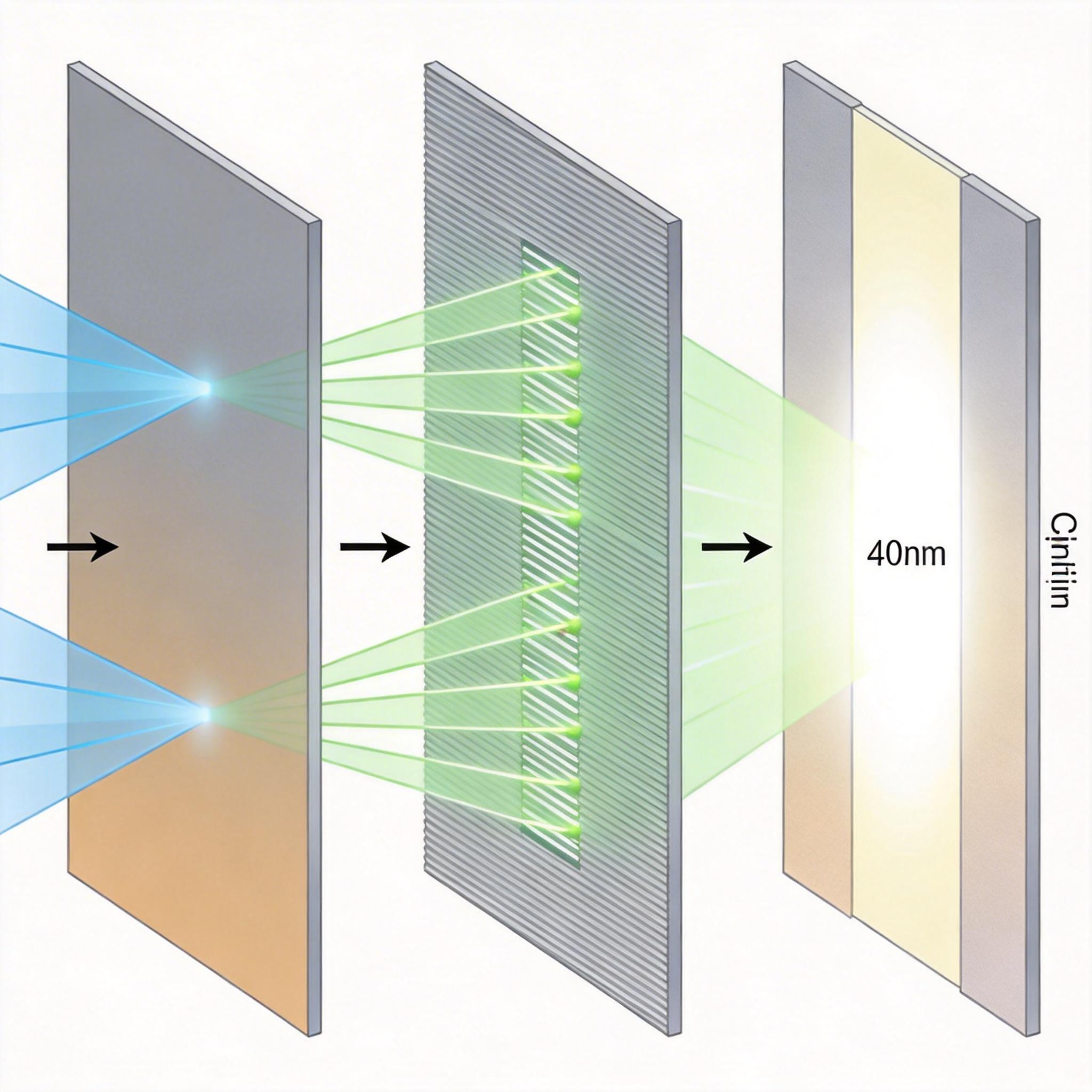 想象一下:一根人类头发的直径大概是50微米,也就是50000纳米。现在有一层薄膜,只有40纳米厚——是头发丝的1/1250。这层薄到几乎看不见的东西,居然能把波长比它大几十倍的红外光牢牢困住,还能把红外光变成肉眼可见的蓝光。