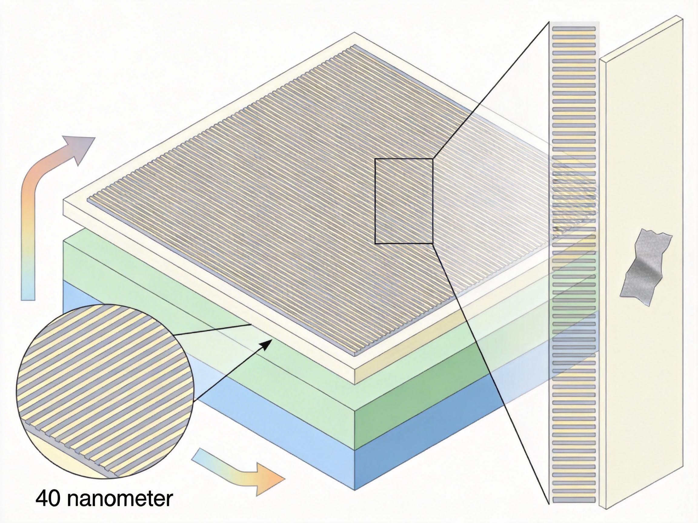 他们用分子束外延(MBE)技术,在几平方英寸的基底上长出了均匀的40纳米厚二硒化钼薄膜——这解决了过去用胶带剥离法只能做出几十微米大小样品的难题,为工业化铺平了路。然后在薄膜上刻出亚波长光栅,条纹间距精准控制在光波长以下。