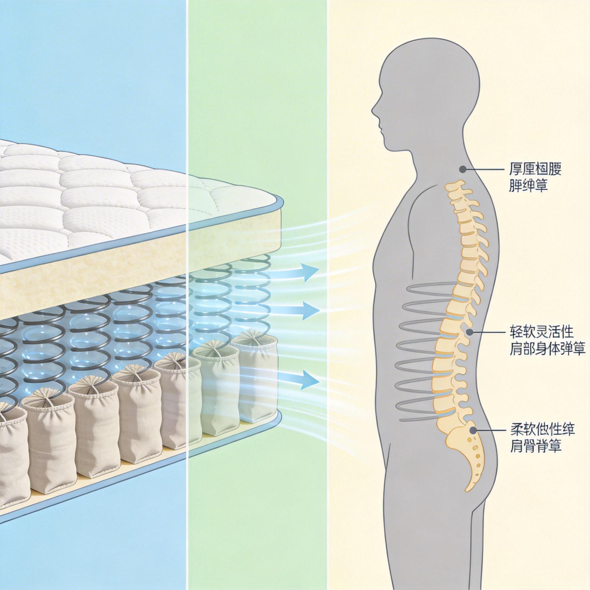 真正让热量不「憋」在床垫里的,是独立袋装弹簧层。每个弹簧被单独包裹在布袋中,彼此之间的空隙形成了天然的空气通道。当你翻身时,身体的压力会挤压弹簧,推动空气在通道里流动,把铜基棉层导过来的热量顺着空隙排出去——这是一种完全被动的「自然通风系统」,不需要插电,也没有噪音。更巧妙的是分区设计:腰部区域的弹簧线径更粗、支撑力更强,肩部和臀部的弹簧更易压缩,让你的脊柱始终保持自然曲线,不会在睡梦中被迫「弯腰驼背」。
