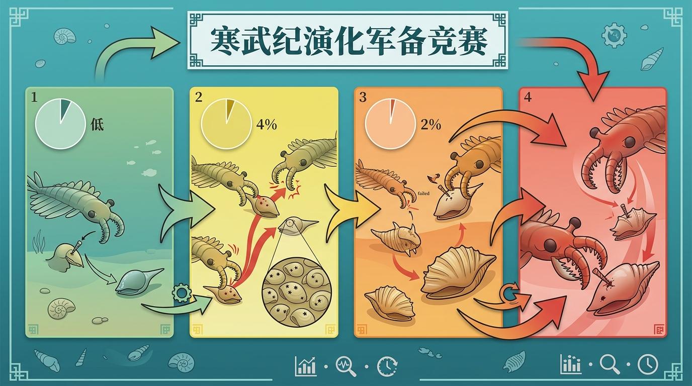 这种“你追我赶”的军备竞赛,是寒武纪大爆发的核心动力。2025年的化石研究显示,当时一种小型带壳生物的壳体厚度,会随着捕食者穿孔频率的增加同步增厚,穿孔比例最高时接近4%,壳体加厚后又回落至2%——猎物的防御升级,立刻倒逼捕食者进化出更强的穿刺能力,两者在短短地质时间里完成了数轮攻防迭代。